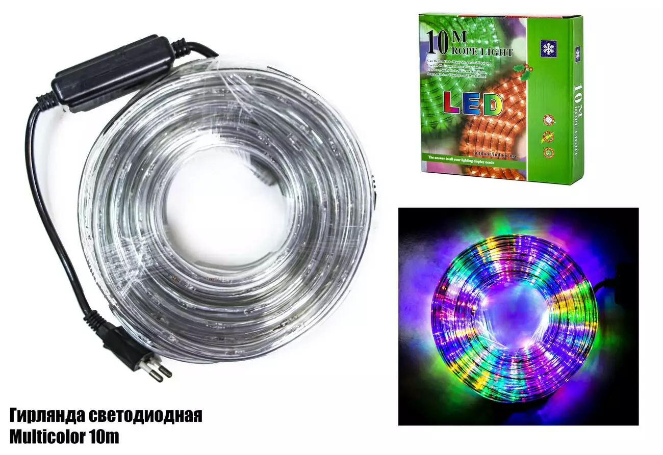 <p>Гирлянда светодиодная уличная 10 метров Multicolor </p><br /> <br /> <p>Светодиодная гирлянда-дюралайт для наружного применения.<br /><br /> Дюралайт - гибкий световой шнур, представляющий собой ленту или трубку из прозрачного пластика, в который запрессована непрерывная гирлянда из миниатюрных лампочек накаливания или светодиодов.</p><br /> <br /> <ul><br /> <li>5 динамических режимов работы.</li><br /> <li>Подсветка - мультиколор.</li><br /> <li>Питание - от сети 220 В.</li><br /> <li>240 лампочек </li><br /> </ul><br /> <br /> <p><iframe frameborder="0" height="315" src="https://www.youtube.com/embed/BG6PR7fs-RM" width="560"></iframe></p><br />