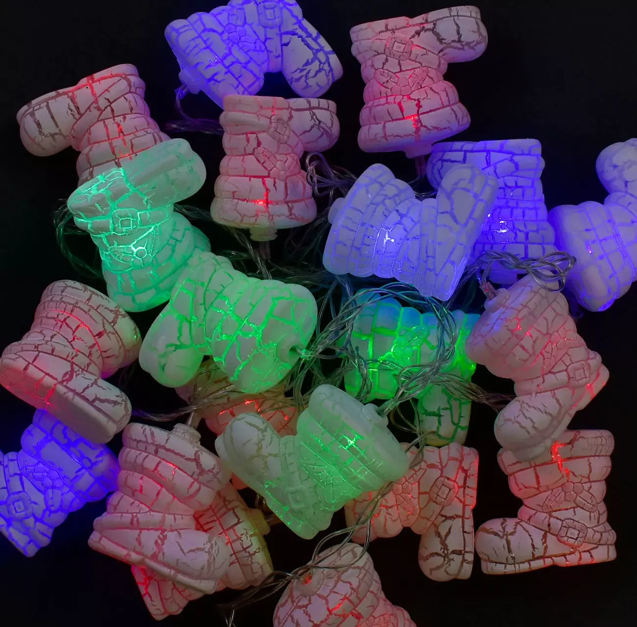 Світлодіодна гірлянда для внутрішнього застосування. Насадки у вигляді чобітка. Підсвічування – мультиколор. Живлення – від мережі 220 В.