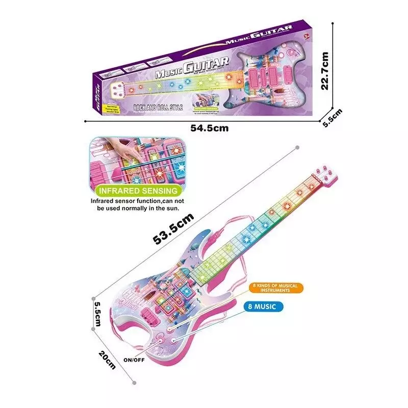 Відчути себе справжньою зіркою, яка виступає на сцені перед мільйонами фанатів дуже просто! Крута гітара з яскравим привабливим дизайном дуже швидко зацікавить дитину та надасть можливість стати справжнім музикантом. Ці струни та наплічний ремінь для вас - мерщій беріть гітару в руки, бо на вас чекає неймовірна музична подорож! Особливості: - гарний дизайн гітари; - яскраве підсвічування; - легке використання; - 8 режимів пісні; - іграшка працює від 3-х батарейок “АА” (не додаються); - гітара виглядає як мініатюра справжньої гітари, має струни та наплічний ремінь.