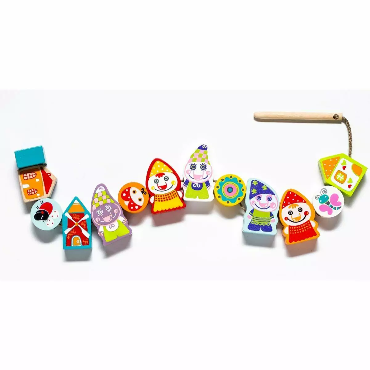 Дерев'яна іграшка ГНОМИ - СИЛЯНКИ — іграшка, виконана з дерев яних деталей. Такою іграшкою діти розвивають координацію рухів і вивчають кольори та тактильні відчуття. Іграшка ГНОМИ - СИЛЯНКИ від Cubika допоможе направити енергію малюка в потрібне русло. Набір містить 12 дерев'яних фігурок із малюнком і шнур з дерев'яним стрижнем. Нанизуючи фігурки гномиків на шнур у довільному порядку дитина розвиває дрібну моторику рук і координацію, і в результаті виходить кумедна гірлянда, що стане для неї веселою іграшкою. Комплект упакований у барвисту картонну коробку.
