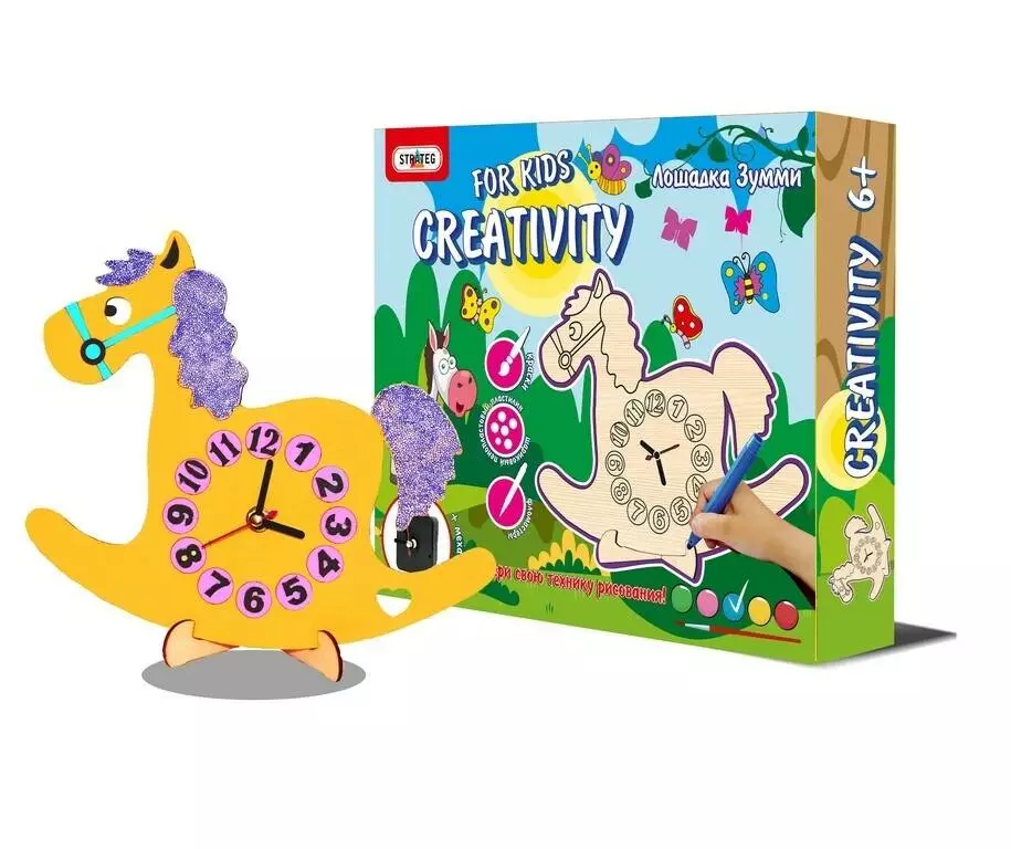 Набір креативних годинників з екологічно чистого матеріалу складається з фанерної основи з підставкою, годинникового механізму зі стрілочками, набір гуашевих фарб з пензликом, фломастерів, кулькового пенопластового пластиліну. Годинники можуть служити навчальним посібником, і відмінною прикрасою для дитячої кімнати, і, безсумнівно, відмінним подарунком! 30,5см-25см-4,5см