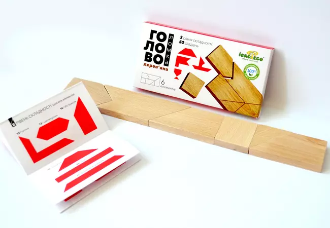 Цікава дерев'яна головоломка для дітей та дорослих! Головоломка складається з 6 елементів та утворює прямокутник розміром 15х7см. У наборі інструкція на 16 ст, яка включає 50 завдань різної складності. Головоломка - розвивальна іграшка, що сприяє тренуванню пам'яті, логіки, уяви. Чудова нагода весело провести час у колі сім'ї чи друзів!