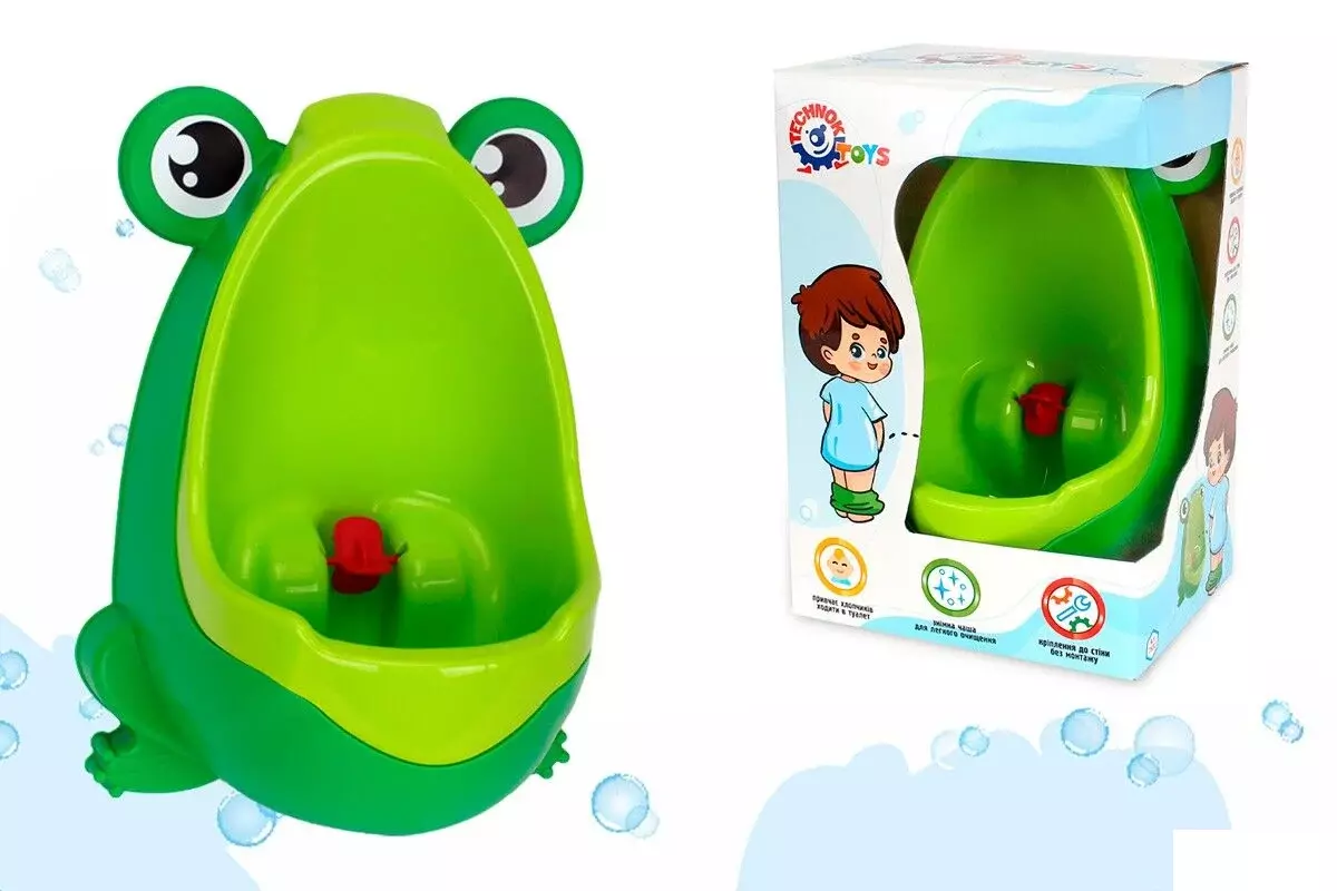 Новинка для хлопчиків - пісуар дитячий, який дозволить малюкам пісяти стоячи й бути схожим на тата. Знайомство дітей з горщиком - відповідальний і важливий процес дорослішання. Для хлопчиків пропонуємо новинку - пісуар дитячий, який дозволить малюкам писати стоячи та бути схожим на тата. Особливості вироби: Веселий дизайн "жаба" і цікаві наліпками "очі" неодмінно привернуть увагу дитини до пісуарів. Додаткового інтересу додає крильчатка, що обертається при попаданні струменя. Це дозволяє зосередитися на процесі та спонукає дітей потрапляти в ціль. Внутрішня частина пісуара легко знімається, її зручно мити та встановлювати на місце. Виріб можна кріпити 2-я способами до стіни: на присоски (входять в комплект) або дюбель. Фіксація пісуара на присоски дозволяє легко міняти висоту, відповідно до зростання Вашого малюка. Пісуар виготовлений з нетоксичного пластику без запаху. Використання тільки якісних барвників забезпечує яскравий колір вироби протягом тривалого терміну використання. Після кожного використання виріб необхідно ретельно промивати теплим мильним розчином. Пакування - яскрава напіввідчинена коробка 30.2 х 21 х 16.5 см.