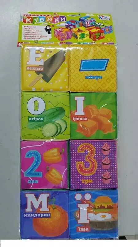 гр Кубики 10950 (36/2) ""4FUN Game Club"", ""Їжа"", 6 штук, м'які, водонепроникна тканина, літери, цифри, арифметичні знаки, в пакеті