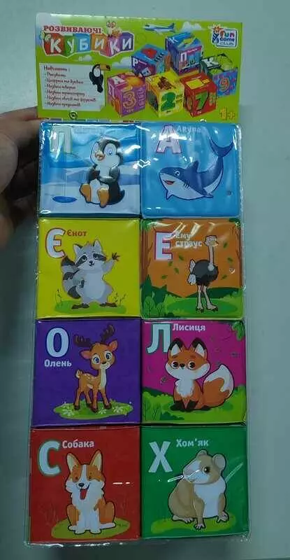 гр Кубики 40413 (36/2) ""4FUN Game Club"", ""Тварини"", 6 штук, м'які, водонепроникна тканина, літери, геометричні фігури, в пакеті