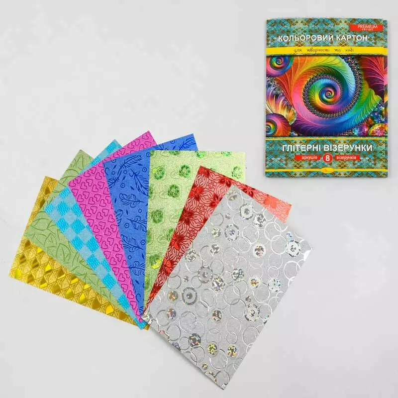 гр Набір кольорового картону ""Глітерні візерунки"" Premium А4, 8 аркушів ККГВ-А4-8 ""Апельсин""