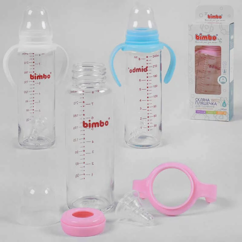 гр Пляшка скляна 33812 (48) з силіконовою соскою, ""BIMBO"", 240 мл, 3 кольори, 1шт в коробці