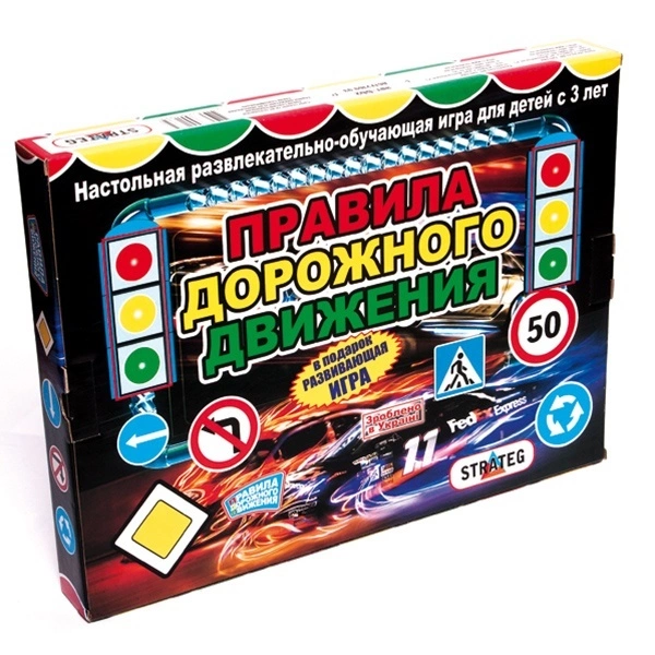 Настільна розважально - навчальна гра, розповість дітям про правила дорожнього руху. Барвисто оформлене ігрове поле наповнене зображеннями дорожніх знаків, що в захоплюючій формі познайомить малюка з правилами дорожнього руху. Розмір упаковки: 38х29х4 см Комплектація: одне поле, 4 фішки, кубик, розфарбування. Вік: 4 + Гра сприяє розвитку: логіки і творчих здібностей дитини мислення, уваги, сприйняття і уяви стратегічних навичок кругозору дитини. Вироблено: в Україні, ТМ STRATEG Мова: російська