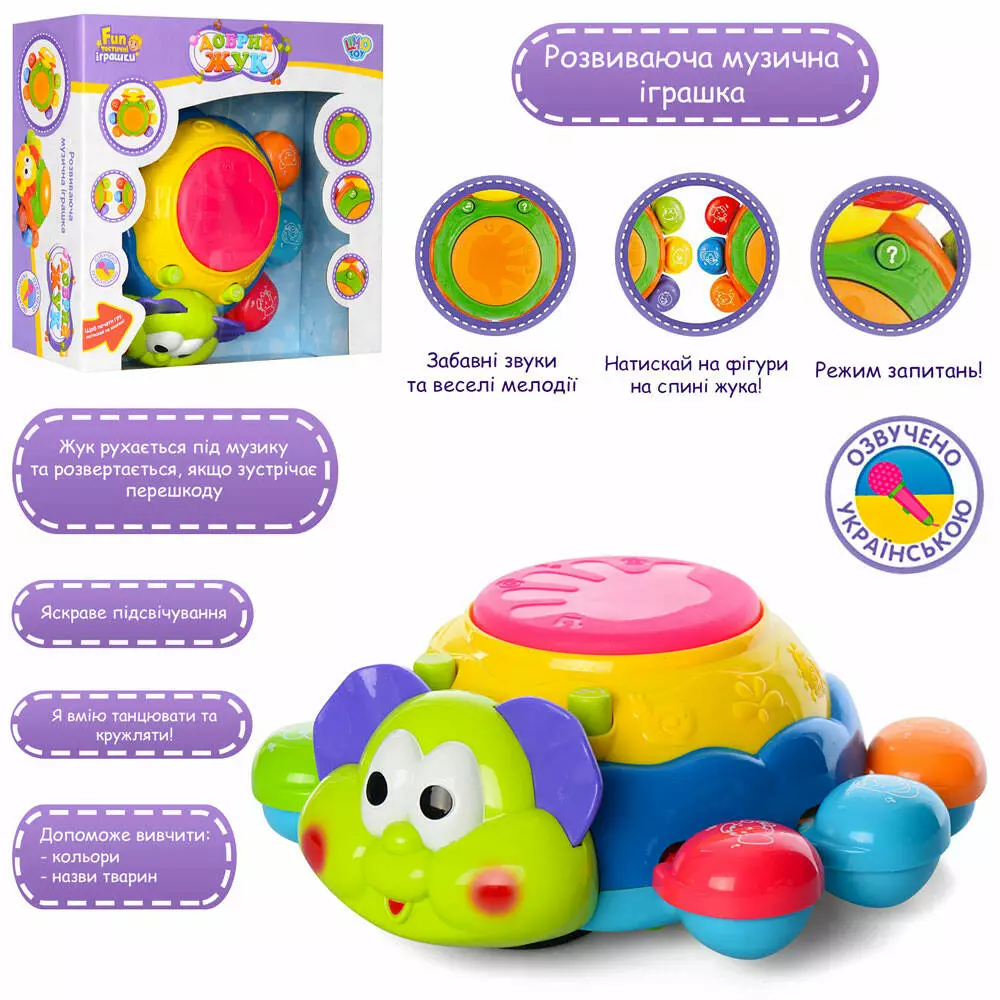 Гра 7259UA жук, навч. (кольори, тварини), танцює, муз. (укр.), світло, бат., кор., 25-25-10 cм.