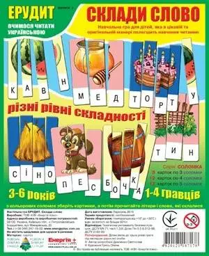 комплектність: 32 картки - 96 соломок (8 карток на 3 букви, 12 карток на 4 букви, 12 карток на 5 букв з картону 2 мм
