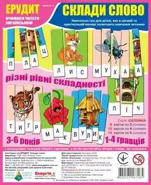 комплектність: 32 картки - 96 соломок (8 карток на 3 букви, 12 карток на 4 букви, 12 карток на 5 букв з картону 2 мм