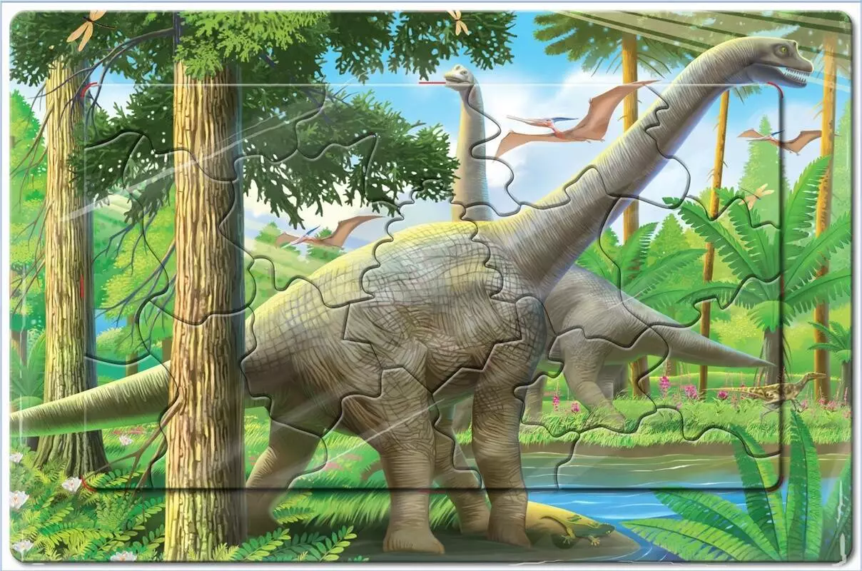 Гра-головоломка з серії "Динозаври". Фігурний пазл в рамці. 18 елементів + рамка з основою, з товстого картону 2 + 2 мм. Гра спрямована на розвиток інтелекту дитини. Яскраві і барвисті картинки не залишать байдужими вашого непосиду. В процесі гри малюк навчиться логічно мислити, розвине просторову уяву, пам'ять, сприйняття і наочно-образне мислення, поліпшить координацію рухів і дрібну моторику рук і пальчиків.