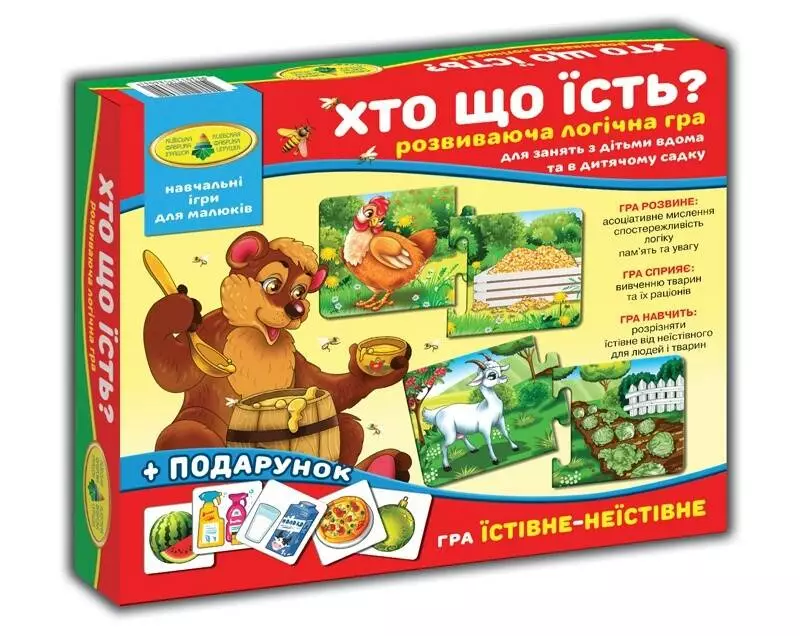 Розвиваюча гра для малюків дошкільного віку допоможе дитині вивчити деяких тварин і дізнатися, чим вони харчуються. Гра розвине логічне мислення, пам'ять, увагу, словниковий запас і дрібну моторику рук. Є кілька варіантів гри.