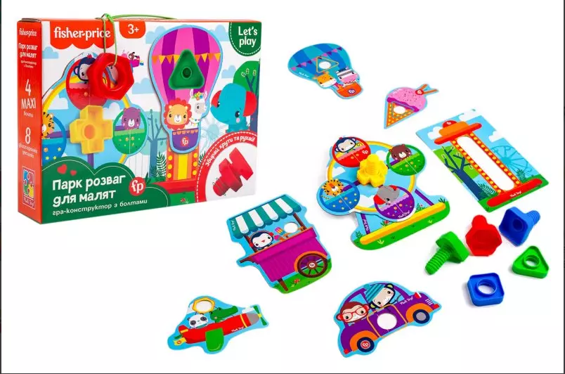 Гра-конструктор "Fisher Price. Парк розваг для малят" VT2905-21 (укр). В процесі гри дитина познайомиться з тваринами, навчиться конструювати, а також потренується логічне мислення, пам'ять, фантазію і дрібну моторику. Комплектація: 13 двосторонніх деталей, 4 пластикові болти, 4 гайки, інструкція.