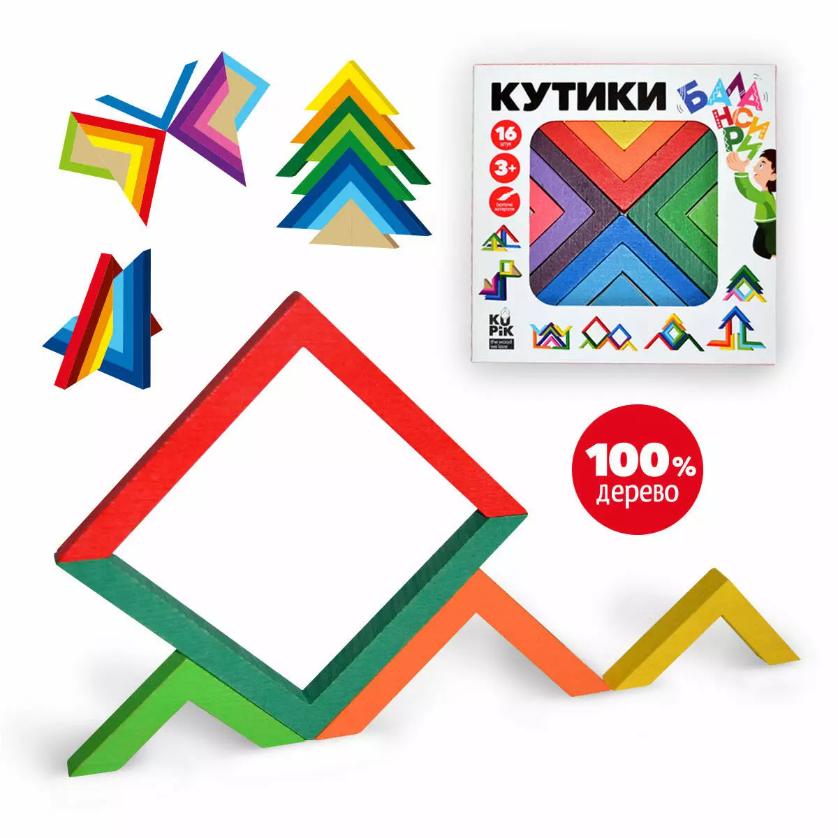 "Кутики-балансири" з натурального дерева - чудова іграшка для розвитку дрібної моторики, координації і точності рухів, а також просторового мислення малюка. Яскраві кольори, оптимальний розмір кутиків, а також цікаві завдання, вказані на упаковці - прості площинні мозаїки для менших та складніші об'ємні моделі для старших діток - усе для того, щоб дитина поверталася до цієї іграшки знову і знову! Також іграшка розвиває наполегливість, бажання отримати результат, винахідливість, фантазію, сенсорні відчуття. Для фарбування використано європейські сертифіковані лако-фарбові матеріали на водній основі, безпечні для дитини. Підходить як для одного, так і для кількох гравців. Розміри Довжина 210.0 (мм) Ширина 210.0 (мм) Висота 12.0 (мм) Вага 300 г Упаковка Упаковка Картонна коробка Довжина упаковки 210.0 (мм) Ширина упаковки 210.0 (мм) Висота упаковки 12.0 (мм)