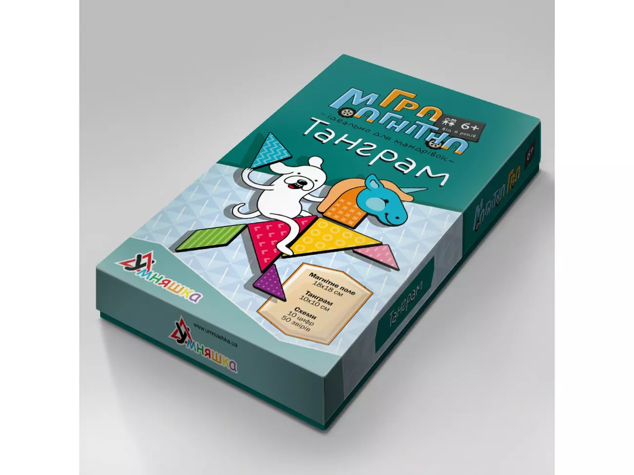 Магнітна гра "Танграм" -це головоломка, яка складається з 7 плоских фігур, з яких можна складати різні фігури. У нашому наборі Ви знайдете схеми для складання цифр і тварин. Склад: магнітне поле 20х20см, магнітний танграм 10х10см, схеми 10 цифр і 50 тварин. Коробка 23х12,5х2,5см. Від 6 років.