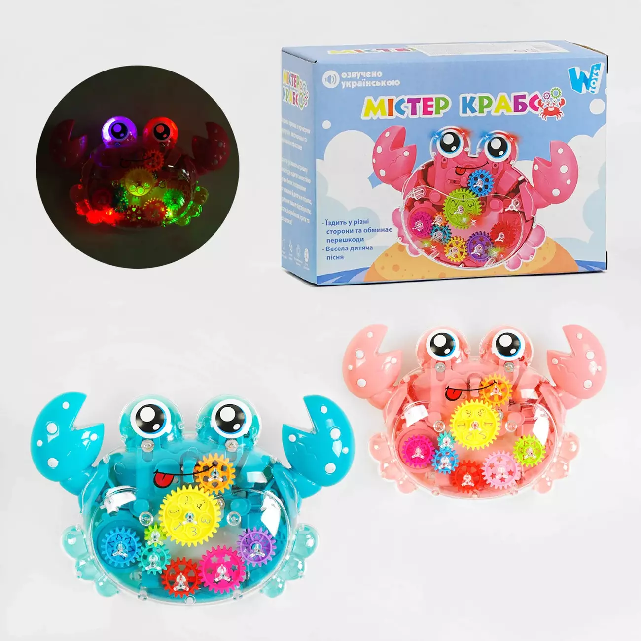 Містер Крабс від ТМ "WToys" - веселий друг малюків, який завжди готовий до веселощів! Яскрава іграшка з прозорим корпусом не дасть дитині нудьгувати: достатньо увімкнути активний режим, і Містер Крабс почне рухатись та співати веселу пісеньку українською. Кольорові шестерні починають рухатись та підсвічуватись яскравим світлом. Містер Крабс ніколи не втомлюється та завжди готовий прикрасити дозвілля малюка! Особливості: - інтерактивний краб яскравої колірної гами; - виконаний з міцного первинного пластику; - прозорий корпус з кольоровими шестернями, які рухаються та підсвічуються; - іграшка має колесо вільного ходу; - весела пісенька українською; - рух краба, звукові та світлові ефекти працюють від 3 батарейок типу АА (до комплекту не входять).