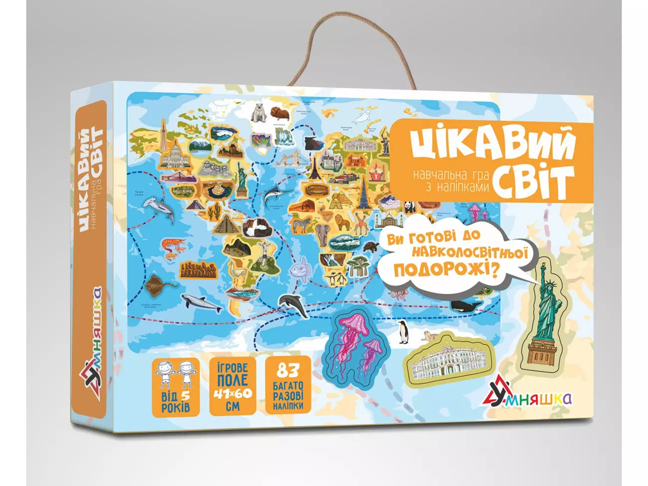 Ви готові до навколосвітньої подорожі? Тоді вирушаємо разом з навчальною грою "Цікавий світ"! На Вас чекають 83 цікавинки, де ми побачимо різні тварини та рослини, пам'ятки культури та нові досягнення людства. + Багаторазові наліпки, що довго залишаються липкими + Реалістичні ілюстрації + Великий постер, у вигляді карти, що прикрасить Вашу оселю "Цікавий світ" - не просто гра, а справжній провідник у світ захопливої географії! Склад: ігрове поле 41х60см, багаторазові наліпки–83 шт., коробка із шнурком. Розмір коробки: 30,5х4х21см Від 5 років