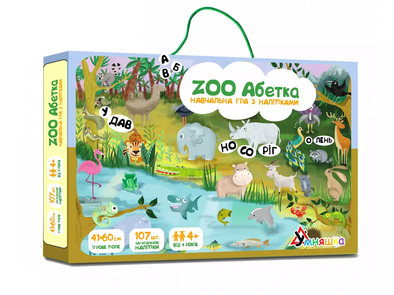 Zoo Абетка - ваш незамінний помічник для вивчення букв та навчання читанню! Вивчайте з дітьми букви української абетки та назви тварин, вчіть читати по складах та утворювати нові слова, рахуйте звірят і вигадуйте цікаві ігри з ними. Букви та склади зроблені у вигляді багаторазових наліпок Склад: ігрове поле 41х60см, багаторазові наліпки-107шт., коробка із шнурком. Розмір коробки: 30,5х4х21см Для дітей від 4 років.