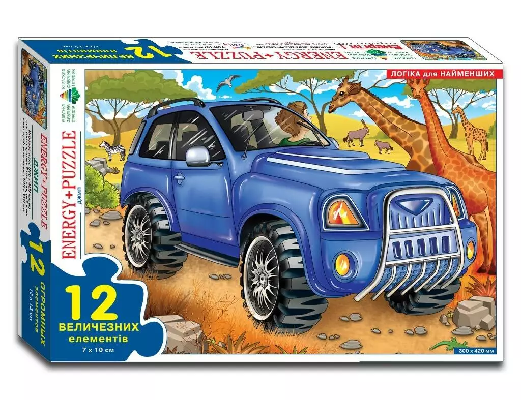Логічна гра-Пазл для самих На величезному ігровому полі розміром 300 х 420 мм зображений Джип. Поле розрізати на 12 частин, з яких потрібно зібрати цілу картинку. ПРАВИЛА ГРИ 1. Складіть на столі картинку-пазл, нехай дитина уважно розгляне його. 2. Вийміть один (потім кілька) елементів пазла, покладіть поруч лицьовою стороною вгору. Запропонуйте дитині покласти його (їх) на місце. 3. Поступово ускладнюйте завдання. Вийміть один (потім кілька) елементів, переверніть його (їх) лицьовою стороною вниз, покладіть поруч. Запропонуйте дитині правильно покласти його (їх) на місце. 4. Розберіть пазл на окремі елементи (перемішайте елементи), запропонуйте дитині самостійно сосбрать картинку. Гра навчить складати з частин ціле; зіставляти окремі елементи за формою, кольором, розміром. Гра розвине просторову уяву, образне і логічне мислення, сприйняття, дрібну моторику рук. комплектність: 12 елементів з картону товщиною 2 мм. Кожен елемент приблизно 100 х 120 мм