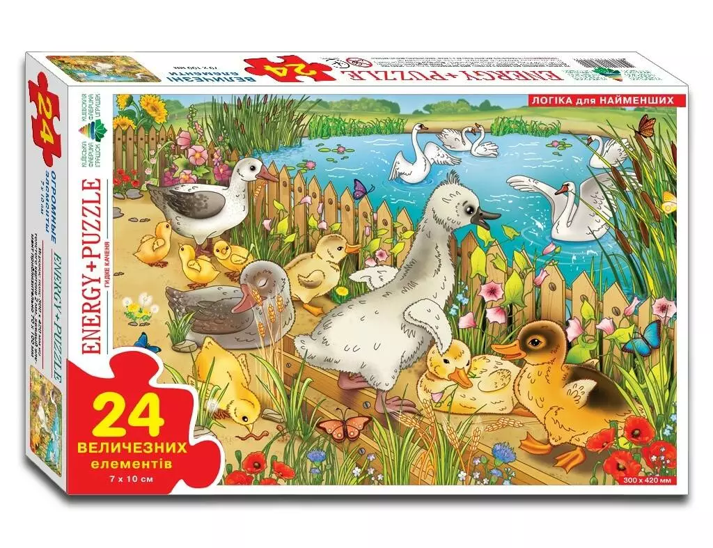 Логічна гра-Пазл для самих На величезному ігровому полі розміром 300 х 420 мм зображений сюжет з казки Гидке каченя. Поле розрізати на 24 частини, з яких потрібно зібрати цілу картинку. ПРАВИЛА ГРИ 1. Складіть на столі картинку-пазл, нехай дитина уважно розгляне його. 2. Вийміть один (потім кілька) елементів пазла, покладіть поруч лицьовою стороною вгору. Запропонуйте дитині покласти його (їх) на місце. 3. Поступово ускладнюйте завдання. Вийміть один (потім кілька) елементів, переверніть його (їх) лицьовою стороною вниз, покладіть поруч. Запропонуйте дитині правильно покласти його (їх) на місце. 4. Розберіть пазл на окремі елементи (перемішайте елементи), запропонуйте дитині самостійно сосбрать картинку. Гра навчить складати з частин ціле; зіставляти окремі елементи за формою, кольором, розміром. Гра розвине просторову уяву, образне і логічне мислення, сприйняття, дрібну моторику рук. комплектність: 24 елемента з картону товщиною 2 мм. Кожен елемент приблизно 70 х 100 мм