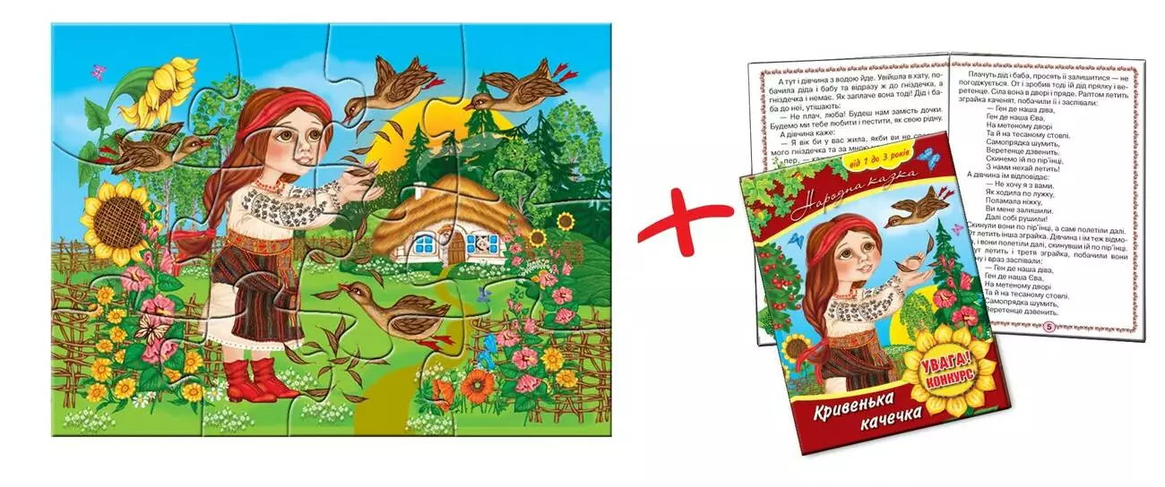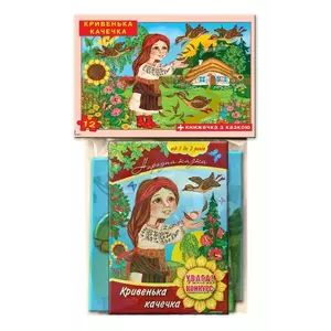 Логічна гра-Пазл для самих За мотивами української народної казки "Хромая качечка". На величезному ігровому полі розміром 300 х 420 мм зображений сюжет з казки. Поле розрізати на 12 частин, з яких потрібно зібрати цілу картинку. У комплекті є повнокольоровий книжечка з казкою. Дитячі казки розширюють словниковий запас малюка, допомагають правильно будувати діалог, розвивають зв'язну логічну мова. Складаючи елементи пазла малюк навчиться складати з частин ціле, зіставляти окремі елементи за формою, кольором, розміром. Казка допомагає формувати основи поведінки і спілкування. Казки розвивають фантазію, уяву і "слухову" пам'ять дитини, а так само його творчий потенціал. Гра розвине просторову уяву, образне і логічне мислення, сприйняття, дрібну моторику рук. ПРАВИЛА ГРИ 1. Складіть на столі картинку-пазл, нехай дитина уважно розгляне його. 2. Вийміть один (потім кілька) елементів пазла, покладіть поруч лицьовою стороною вгору. Запропонуйте дитині покласти його (їх) на місце. 3. Поступово ускладнюйте завдання. Вийміть один (потім кілька) елементів, переверніть його (їх) лицьовою стороною вниз, покладіть поруч. Запропонуйте дитині правильно покласти його (їх) на місце. 4. Розберіть пазл на окремі елементи (перемішайте елементи), запропонуйте дитині самостійно зібрати картинку.
