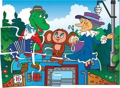 Логічна гра-Пазл для самих На величезному ігровому полі розміром 300 х 420 мм зображений сюжет з казки про Крокодила Гену і Чебурашку. Поле розрізати на 12 частин, з яких потрібно зібрати цілу картинку. ПРАВИЛА ГРИ 1. Складіть на столі картинку-пазл, нехай дитина уважно розгляне його. 2. Вийміть один (потім кілька) елементів пазла, покладіть поруч лицьовою стороною вгору. Запропонуйте дитині покласти його (їх) на місце. 3. Поступово ускладнюйте завдання. Вийміть один (потім кілька) елементів, переверніть його (їх) лицьовою стороною вниз, покладіть поруч. Запропонуйте дитині правильно покласти його (їх) на місце. 4. Розберіть пазл на окремі елементи (перемішайте елементи), запропонуйте дитині самостійно сосбрать картинку. Гра навчить складати з частин ціле; зіставляти окремі елементи за формою, кольором, розміром. Гра розвине просторову уяву, образне і логічне мислення, сприйняття, дрібну моторику рук. комплектність: 12 елементів з картону товщиною 2 мм. Кожен елемент приблизно 100 х 120 мм