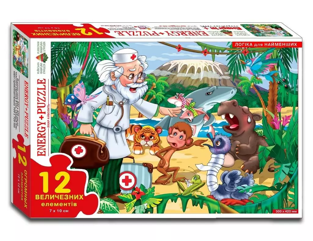Логічна гра-Пазл для самих На величезному ігровому полі розміром 300 х 420 мм зображений сюжет мультика Доктор Айболить. Поле розрізане на 12 частин, з яких потрібно зібрати цілу картинку. ПРАВИЛА ГРИ 1. Складіть на столі картинку-пазл, нехай дитина уважно розгляне його. 2. Вийміть один (потім кілька) елементів пазла, покладіть поруч лицьовою стороною вгору. Запропонуйте дитині покласти його (їх) на місце. 3. Поступово ускладнюйте завдання. Вийміть один (потім кілька) елементів, переверніть його (їх) лицьовою стороною вниз, покладіть поруч. Запропонуйте дитині правильно покласти його (їх) на місце. 4. Розберіть пазл на окремі елементи (перемішайте елементи), запропонуйте дитині самостійно сосбрать картинку. Гра навчить складати з частин ціле; зіставляти окремі елементи за формою, кольором, розміром. Гра розвине просторову уяву, образне і логічне мислення, сприйняття, дрібну моторику рук. комплектність: 12 елементів з картону товщиною 2 мм. Кожен елемент приблизно 100 х 120 мм
