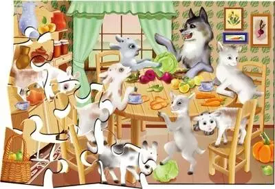 Логічна гра-Пазл для самих На величезному ігровому полі розміром 300 х 420 мм зображений сюжет з казки Вовк і семеро козенят. Поле розрізати на 24 частини, з яких потрібно зібрати цілу картинку. ПРАВИЛА ГРИ 1. Складіть на столі картинку-пазл, нехай дитина уважно розгляне його. 2. Вийміть один (потім кілька) елементів пазла, покладіть поруч лицьовою стороною вгору. Запропонуйте дитині покласти його (їх) на місце. 3. Поступово ускладнюйте завдання. Вийміть один (потім кілька) елементів, переверніть його (їх) лицьовою стороною вниз, покладіть поруч. Запропонуйте дитині правильно покласти його (їх) на місце. 4. Розберіть пазл на окремі елементи (перемішайте елементи), запропонуйте дитині самостійно сосбрать картинку. Гра навчить складати з частин ціле; зіставляти окремі елементи за формою, кольором, розміром. Гра розвине просторову уяву, образне і логічне мислення, сприйняття, дрібну моторику рук. комплектність: 24 елемента з картону товщиною 2 мм. Кожен елемент приблизно 70 х 100 мм