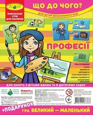 Комплектність: Картки «Що до чого? Професії "- 72 (з картону 2 мм), Картки «Великий-маленький» - 32 (з картону 2 мм)