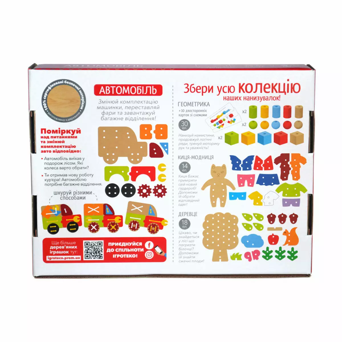 Цікаво перетворювати легковий автомобіль на вантажівку? Які шини потрібні для міських доріг, а які для лісів? Міняй комплектацію автомобіля, переставляй фари та завантажуй багажне відділення! Гра-шнурівка - це чудова іграшка для маленьких пальчиків: нанизування елементів на кольорові шнуровочки відмінно тренує дрібну моторику рук, пришнуровування деталей до дерев'яної основи удосконалює координацію рухів, а велика кількість можливих комбінацій елементів та їх розташування на основі розвиває уяву, образне мислення. Гра заохочує дитину отримати результат, спонукає концентрувати увагу, зосереджуватись, виховує посидючість. Комплектація: - основа - машинка; - 12 кольорових елементів для шнурівки – колеса, боковинки, вікна, фари; - 2 шнурівки (довж. 40 см). Вік: від 3 років. Матеріал: дерево, сертифіковані фарби на водній основі, текстильні шнурівки. Упаковка: картонна коробка. Розмір упаковки: 24х17х4 див.