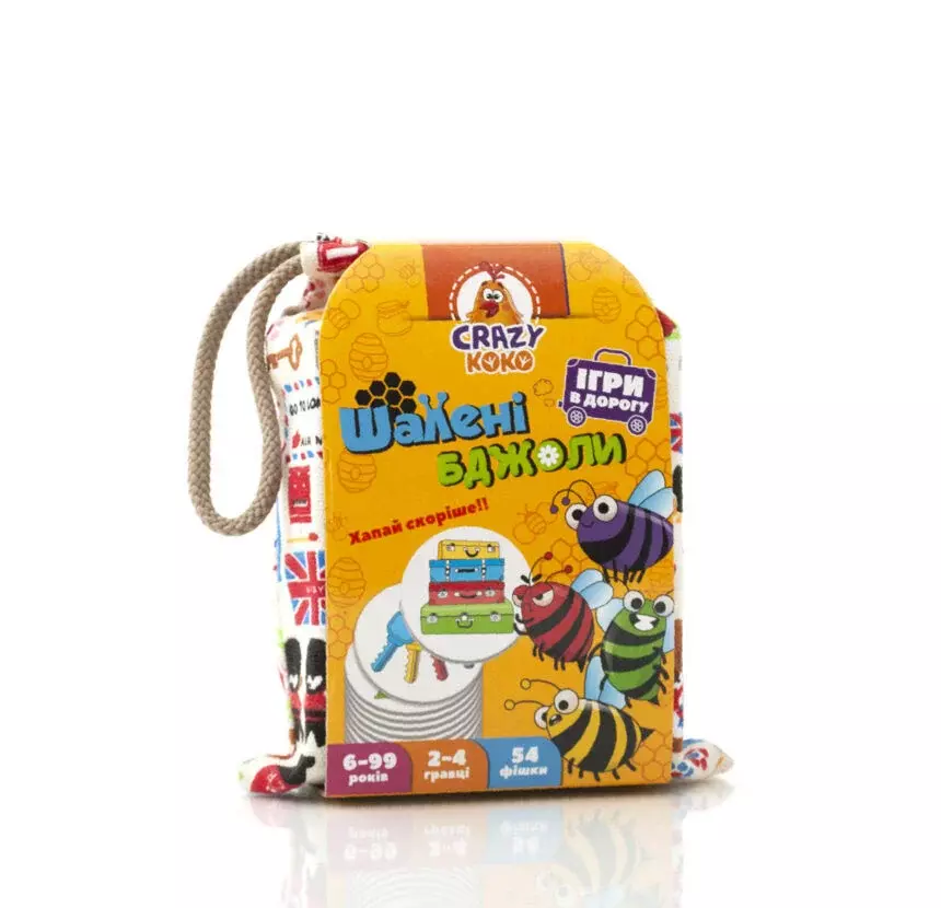 Crazy koko "Шалені бджоли" - це захоплива гра в карти, яка підходить для веселих компаній у віці від 6-ти до 99-ти років! Головний девіз гри - "хапати скоріше." Мета гри - зібрати якомога більше фішок з різнокольоровими малюнками. Підготовка до гри: 1. Поділіть фішки на 2 стопки: з бджолами та з різнобарвним малюнком. 2. Роздайте всім гравцям по 5 фішок з бджолами. 3. Фішки з різнокольоровими малюнками перемішайте і покладіть в стопку лицьовою стороною вниз. Хід гри: 1. Перший гравець перевертає фішку з малюнком. Наприклад на ній зображені валізи: зеленого, червоного, блакитного і жовтого кольору. 2. Всі гравці повинні на швидкість викласти фішки з бджолами в тій послідовності в якій знаходяться валізи за кольорами. Тобто спочатку необхідно викласти зелену бджолу, потім червону, після блакитну, а в кінці зелену. 3. Перемагає той хто виклав фішки правильно і швидше за всіх. Комплектація: - 54 фішки; - інструкція; - мішечок для карт. Гра українською мовою.