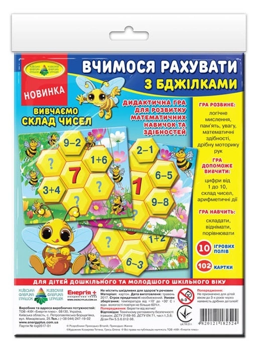 Розвиваюча дидактична гра для дітей дошкільного та молодшого шкільного віку, яка в ігровій манері допоможе вивчити цифри і склад чисел, навчить рахувати в прямому і зворотному порядку, виконувати арифметичні дії в межах десяти. Дитина зможе вивчити не тільки основи арифметики, але і розвине логічне мислення, увагу, уяву, пам'ять, спостережливість, кмітливість, поліпшить дрібну моторику рук. 10 полів, 102 картки