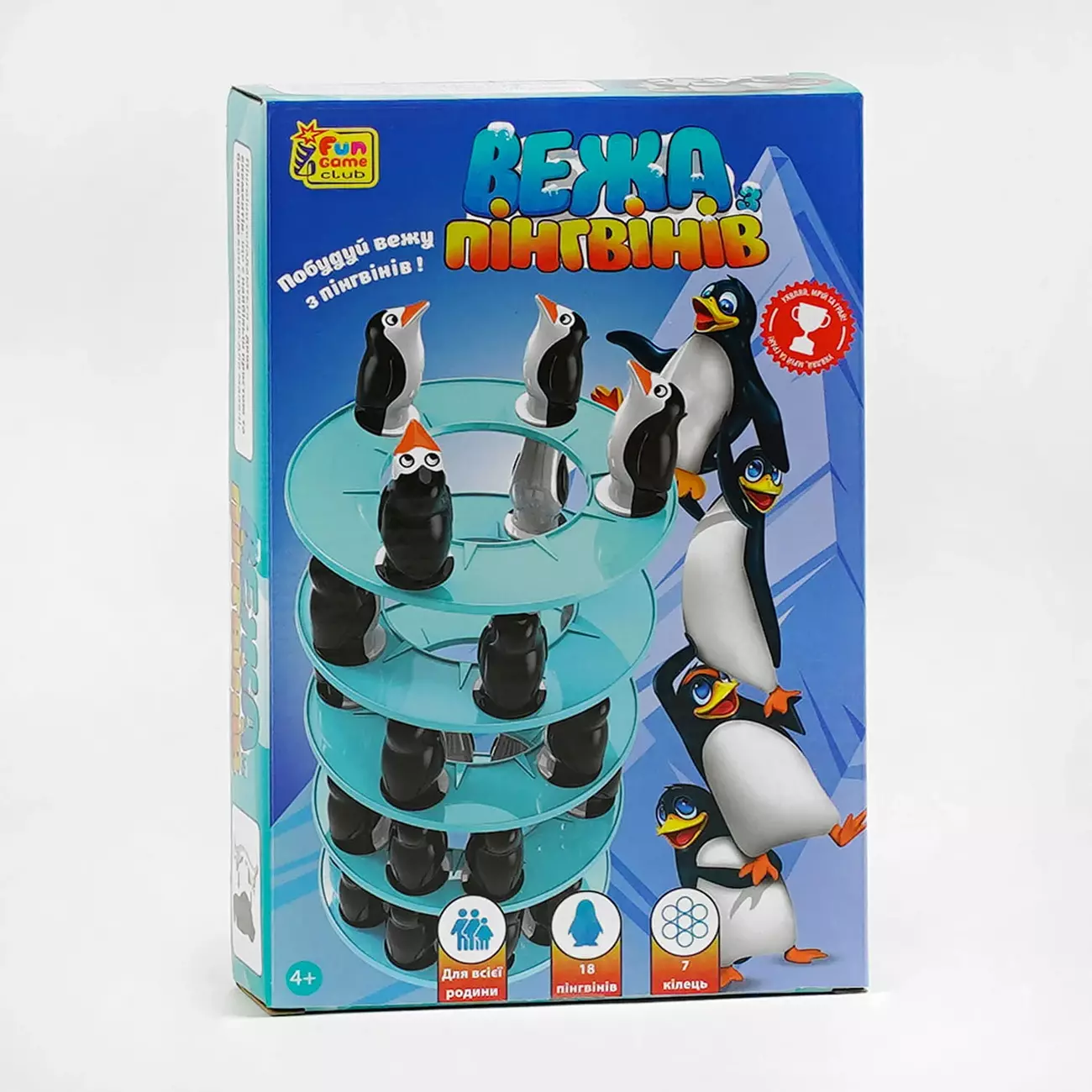 Зграя пінгвінів заблукала і шукає шлях додому. Погода стає холоднішою. Вони туляться один до одного, щоб зігрітися. Однак для того, щоб потрапити додому, їм потрібно віднайти засніжену дорогу. Тому допоможіть птахам побудувати вежу, щоб вони змогли зійти на найвищу її точку і розгледіти шлях додому. А спосіб гри дуже простий — спочатку побудуйте основу вежі та на перших двох поверхах основи розставте по 9 фігурок пташок. Далі кожен гравець по черзі дістає одного пінгвіна з основи та додає його до вежі, а щоразу, коли додається три пінгвіни, ви повинні покласти кільце на них. Але пильнуйте! Гравець, який змусить вежу впасти, вибуває з гри. Продовжуйте, доки не залишиться один гравець, який і стане переможцем! Особливості: - така гра підходить для всієї родини та дозволить весело та цікаво провести час; - комплектація однієї гри складається з 7 кілець та 18 фігурок пінгвінів; - фігурка пташки складається з 2 частин, що робить її безпечною для дітей; - розрахована для гравців віком від 4 років; - мета гри дуже проста — по черзі будуйте вежу для пінгвінів та не дайте їй завалитися; - елементи гри виготовлені з якісного пластику, який є безпечним для здоров’я дітей.