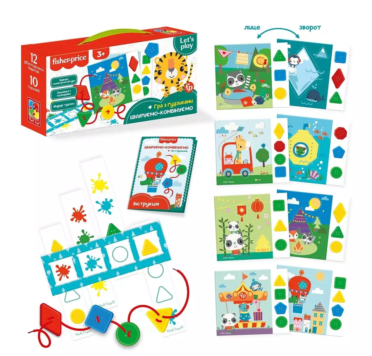 Стильний набір для гри в шнурівку Fisher-price VT 2905-24 від виробника Vladi Toys проведе Вашого малюка в світ простих стібків і міцних вузлів. У наборі Ви знайдете 9 геометричних гудзиків, де в кожної вже зроблено по 4 отвори. Вони виконані в різних кольорах: зелений, жовтий, синій і червоний, а також володіють комфортним розміром, щоб дитині було зручно тримати елемент і грати з ним. 2 шнурка в комплекті допоможуть освоїти принцип роботи з ниткою і голкою, шнурки представлені в 2-х кольорах: жовтий і червоний. Також в набір входить 4 двосторонні картки, на них зображені яскраві, милі і дуже привабливі ілюстрації з тваринами, які зайняті побутовими клопотами. А на ще 6-ти довгастих картках ви знайдете ілюстрації з гудзиками, силуетами і плямами. Комплектація: - 9 ґудзиків; - 2 шнурка; - 4 картинки з тваринами; - 8 довгастих ілюстрацій з прикладами; - інструкція.
