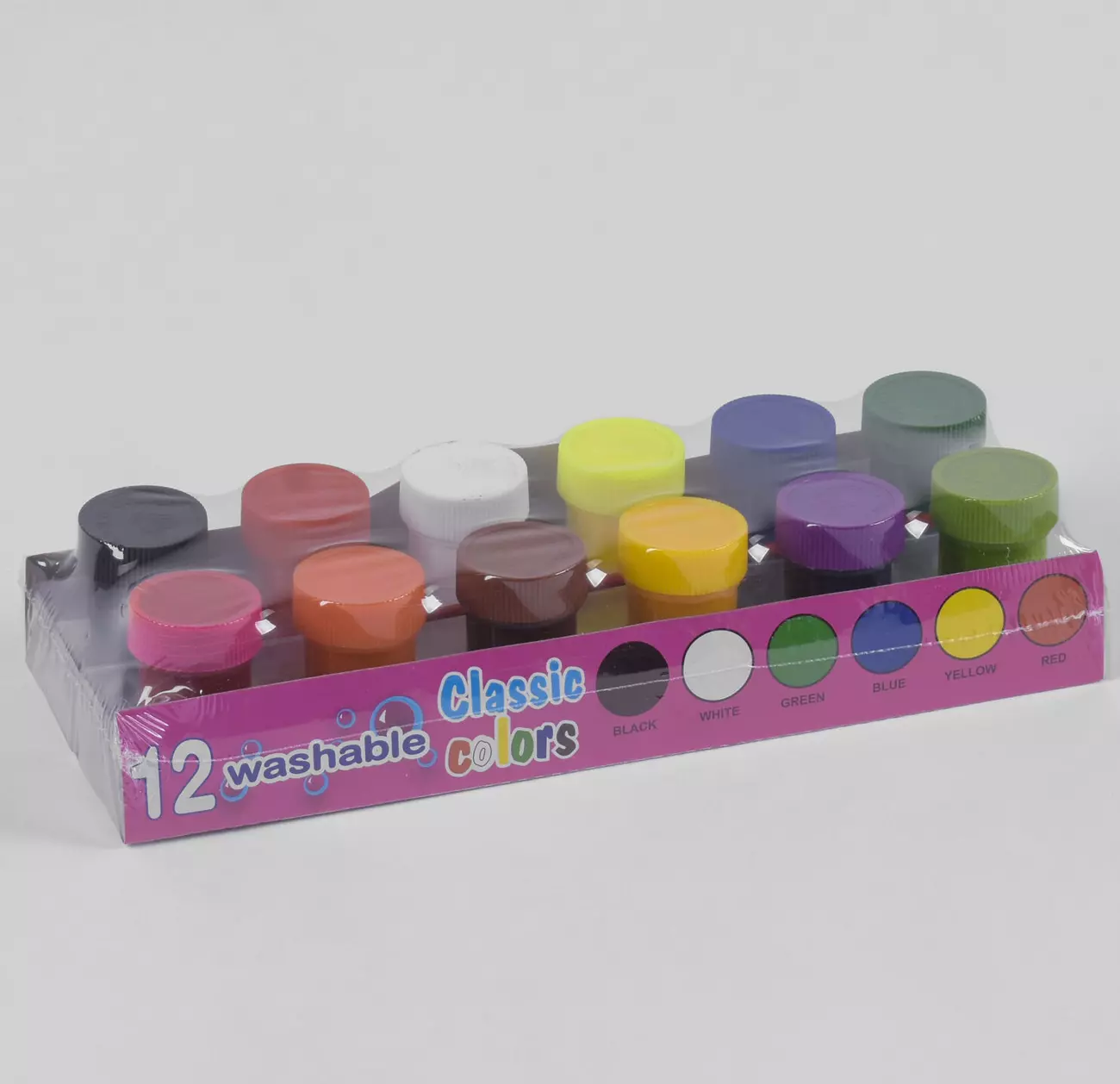 Тип - гуаш; Палітра - 12 кольорів; Особливість - з пензликом; Ємність - прозора баночка; Упаковка - коробка; У коробці - 12 фарб.
