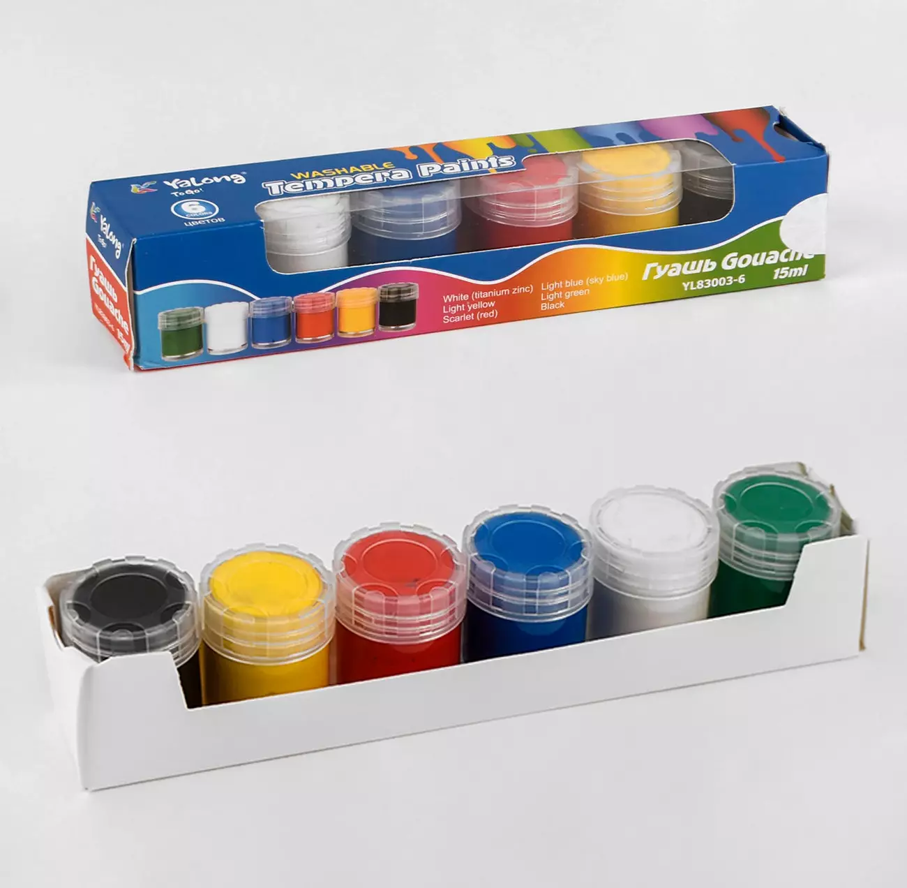 Тип – гуаш; Палітра – 6 кольорів; Ємність – прозора баночка 15 мл; Упаковка – коробка.