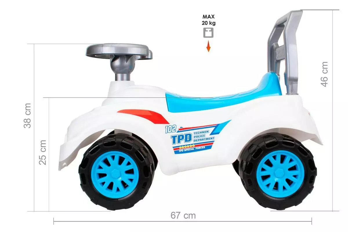 Іграшка "Автомобіль для прогулянок ТехноК" - для спритних маленьких "поліцейських"! Яскраві кольори, цікаві стильні наліпки та ергономічний дизайн привернуть увагу батьків та неодмінно сподобаються малюкам. Автомобіль надійний, міцний, практичний та зручний. Для перевезення всіх необхідних речей передбачено великий багажний відсік під сидінням. Спинка надає додаткову підтримку діткам під час їзди. На кермі є сигнальна кнопка, для сповіщення пішоходів. Так їзда на автомобілі набуває максимальної реалістичності. Іграшка "Автомобіль для прогулянок Спайдер ТехноК" стане надійним другом для Вашого малюка та принесе море радості під час ігор вдома та надворі. Максимальне навантаження 20 кг