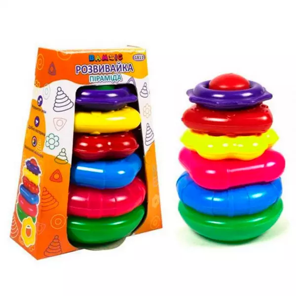 Пірамідка «Розвивайка», упаковка – демонстраційна картонна коробка. Іграшка складається з 6 деталей, які мають різний колір та форму. Висота пірамідки – 19 см, діаметр найбільшого кільця – 12 см. Матеріал – пластик Розмір без упаковки 12,5 x 12,5 x 19 см. Розмір в упаковці 17,5 x 12,5 x 21,5 см Вага 250 г.