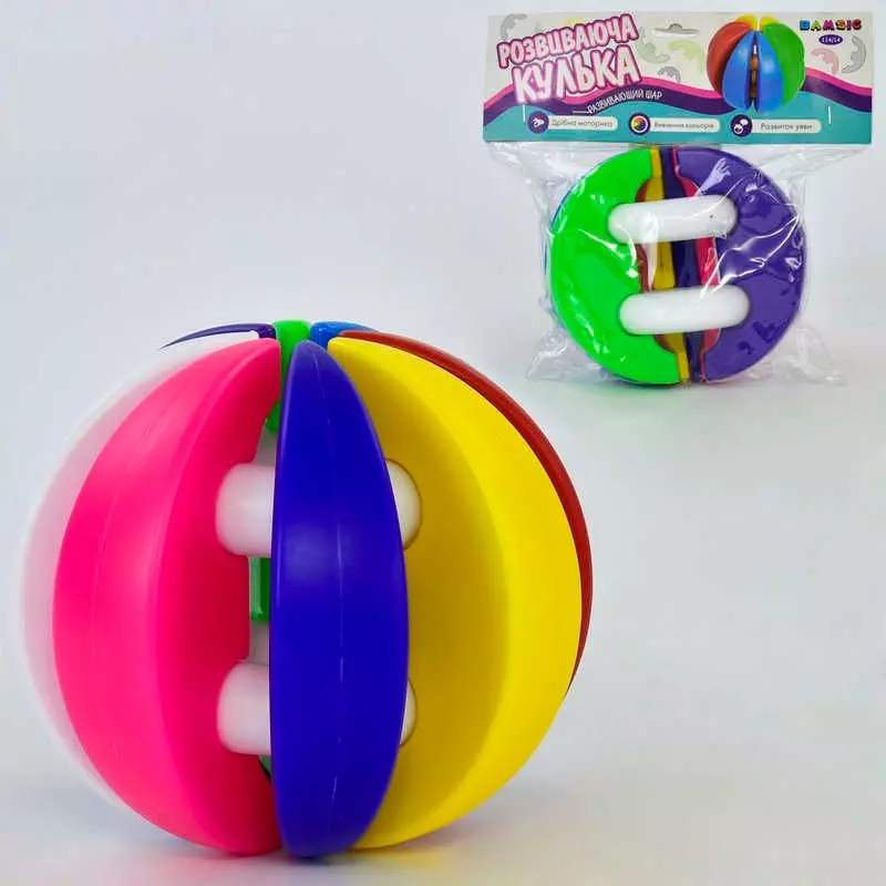 Іграшка дитяча «Розвиваюча кулька» артикул 114/14 ТМ «Bamsic», пакет. Складається з двох кілець, які виступають з основою іграшки, та 8 різнокольорових «часток», які одягаються на кільця. Діаметр - 15 см. Розмір 23 x 15 x 25 см Вага 260 г