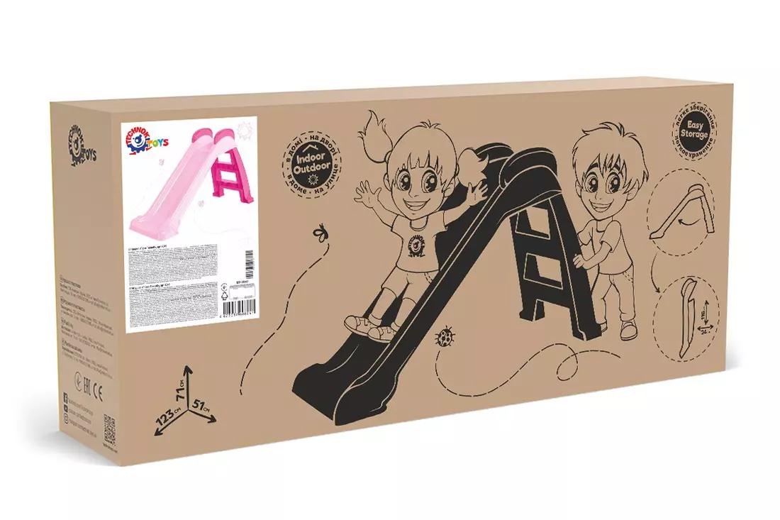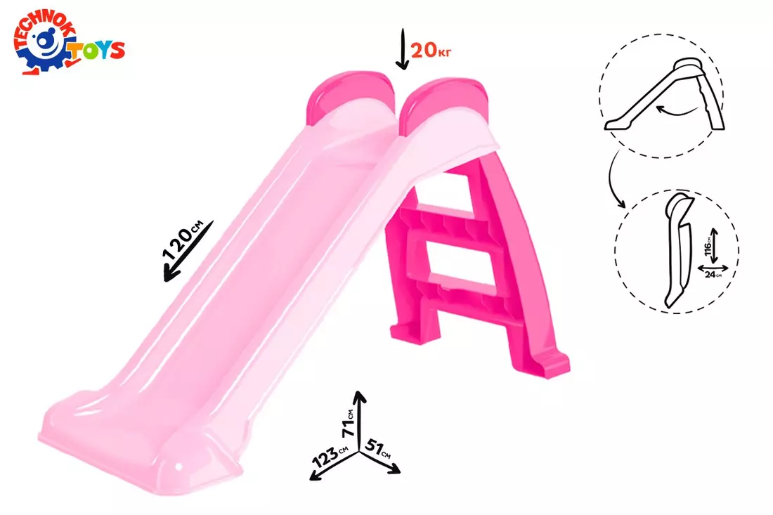 Всі дітлахи – неймовірні непосиди. Активні та рухливі ігри особливо цікаві для хлопчиків та дівчаток. Для малюків від 2-х років найкращим подарунком буде домашня гірка ТехноК. Іграшка принесе море радості дітворі, адже ковзатися на ній можна в будь-яку пору року. Влітку – гірка стане прикрасою та головною іграшкою на подвір'ї. Взимку вона не буде простоювати - компактні розміри дозволяють використовувати гірку також в кімнаті. Гірку ТехноК легко зібрати вдома чи на дитячому майданчику, а при потребі розібрати та скласти. В розібраному варіанті драбинка кріпиться до спуску на спеціальні гачки. В такому вигляді її ширина тільки 24 см, тому гірку зручно розмістити біля шафи чи в комірчині. Конструктори та інженери нашої компанії ретельно працювали над цим виробом та врахували всі зауваження батьків та вихователів, вимоги та норми стандартів. Конструкція виробу надзвичайно міцна та стійка. Особливу увагу ми звернули на з'єднання деталей виробу. Для того, щоб уникнути місць потенційної небезпеки спроєктовано суцільний спуск. Адже по відгуках батьків саме на місцях з'єднання верхньої площадки та спуску відбувається руйнування виробу. Ще одним місцем, яке викликає страх в батьків є отвори в ручках. Дитина може розпочати спуск, не вийнявши руку з цього отвору, і травмуватися. Ручки гірки ТехноК суцільні, без наскрізних отворів. Поверхня сходинок матова для запобігання ковзанню при підйомі по драбині. Увага! Просимо батьків, вихователів, всіх, хто буде поруч малюків УВАЖНО перечитати інструкцію до гірки та НЕУХИЛЬНО дотримуватися вимог та рекомендацій! У Ваших руках здоров'я малюка! Гірка виготовлена з міцного якісного пластику без запаху. На гірці не має гострих країв. Яскраві барвники не вигорають на сонці та забезпечують яскравий колір іграшки протягом тривалого використання. Розмір іграшки в розкладеному виді - висота - 123 см, ширина - 51 см, довжина - 71 см. Довжина спуску - 120 см. Для дітей від 2-х років. Максимальне навантаження – 20 кг. Пакування – коробка з гофрокартону 117,5х51х29 см.