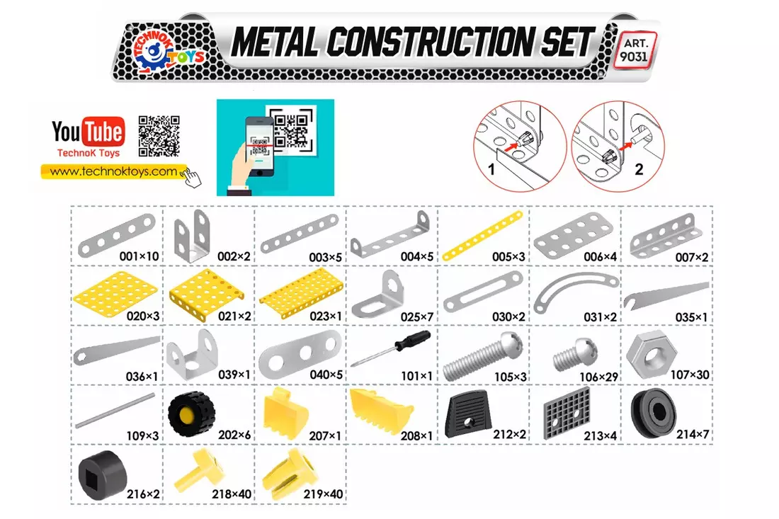 Традиція металевих конструкторів бере свій початок далекому 18 ст. На цих конструкторах виросло багато поколінь відомих винахідників, механіків та інженерів. Завдяки іграшці хлопчаки (та й дівчатка) здобувають перші навички з’єднання деталей гвинтами, гайками, роботи викруткою та ключами. Вони власними руками створюють справжні моделі, що "працюють": різноманітні автомобілі, гелікоптер, кран, трактор, потяг, позашляховик, танк, мотоцикл та багато іншої техніки. Робота з конструктором: викликає у дітей інтерес до роботи машин та механізмів; дає базові поняття про взаємодію окремих частин; знайомить з технічними назвами деталей, простими кресленнями та схемами; розвиває навики логічного мислення, просторову уяву, уважність та фантазію. Металеві конструктори використовуються на уроках в початковій школі, як набори для конструювання з різними способами з'єднання (НУШ). Новітня методика STEM (Science, Technology, Engineering, Mathematics), що набирає обертів, активно застосовує такі конструктори в освітньому процесі. Наприклад можна зібрати модель молекули, квітки, вітряка чи динозавра. Дитина не просто знайомиться з новими напрямами розвитку точних наук та інженерії, а вчиться реалізовувати вивчене на практиці. Металеві конструктори ТехноК вирізняють високою якістю та різноманіттям деталей, цікавим поєднанням металевих та пластикових запчастин. У кожному наборі є викрутка та ключі для збирання моделей. На допомогу юним механікам – кольорова, детальна покрокова інструкція, яку також можна завантажити з нашого корпоративного сайту. Крім того малий винахідник може придумати власні варіанти збирання та нові цікаві моделі. Творча робота є основою розвитку креативного мислення дитини. Ігри з конструктором ТехноК принесуть багато користі та будуть цікавими не тільки малюкам, а й дорослим. Металевий конструктор нового покоління. Перевага іграшки - металеві деталі різних кольорів. Завдяки цьому конструктору дитина може розвивати фантазію, складаючи різні моделі, і отримувати практичні навички роботи з металевими виробами, що стане в нагоді у дорослому житті. Згідно інструкції металевого конструктора можна зібрати 6 моделей: екскаватори різних модифікацій, навантажувач, снігоприбиральну машину та вантажівку. А також інші цікаві моделі, які дитина придумає сама. Пакування - яскрава коробка.