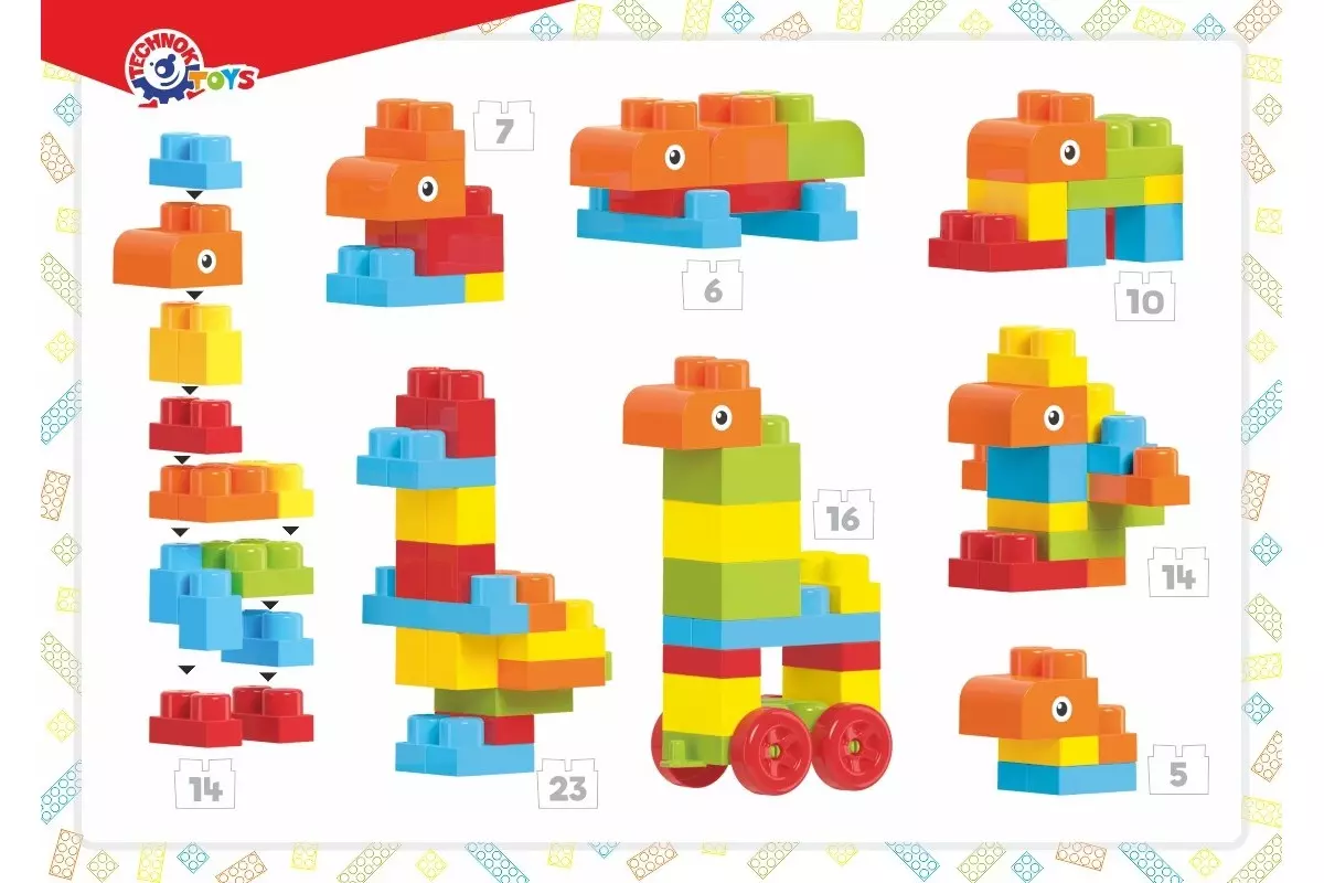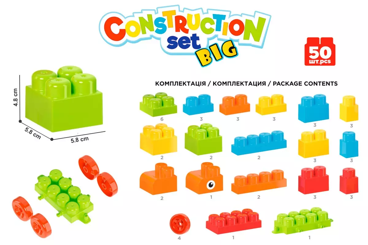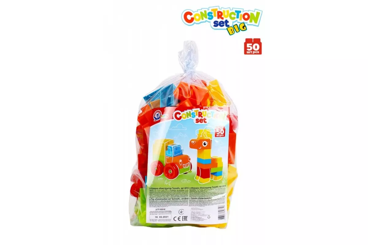Конструктор – одна з найпопулярніших іграшок серед дітей різного віку. Адже це не тільки захоплива гра, а також корисне розвивальне та навчальне приладдя. Можна сконструювати автомобіль, будиночок, космічний корабель та вивчити додавання і дроби! У наборі 50 великих деталей, зручних для діточок вже від 2-х років. Цеглини зі зрізаними кутами для кораблів чи потішних тваринок. Платформи з колесами – взагалі знахідка. Можна збудувати автомобіль, потяг чи літак. А ще платформа стане в пригоді при конструюванні роботів. Фігурні елементи із зображеннями "очей", нанесених методом тамподруку – цікава опція, яка додає "життя" конструктору. Зібрані рибки та фламінго відразу "оживають", з ними діткам цікавіше гратися та, особливо, розмовляти. "Конструктор ТехноК" відповідає всім вимогам безпеки, в елементів відсутні гострі краї та сторонній запах. Деталі мають яскравий колір, що не залишається на дитячих пальчиках. Цеглини приємні на дотик, легко складаються, водночас зібрана конструкція міцна та тримає форму. Кольорова покрокова інструкція є необхідністю, особливо коли дитина знайомиться з конструктором. Збираючи моделі згідно з інструкцією, малюки досліджують можливості конструктора та вивчають ази побудови базових фігур. Чим все ж таки корисні ігри з конструктором? Головна перевага цієї іграшки — це розвиток важливих навичок для повноцінного розвитку дітей. Конструювання з різних елементів розвиває дрібну моторику та допомагає тренувати координацію рухів. Також батьки, граючись з дітками, вчать їх новим словам: назви кольорів, форм, тварин, будівель та транспорту. Складаючи цілу конструкцію, у дітей розвивається уява та просторове мислення. Захопливі ігри з конструктором виховують увагу, терпіння та посидючість. Граючись разом, дітки розвивають соціальні та комунікативні навички. Їм доводиться співпрацювати, обговорювати подальші кроки та домовлятися для розв'язання поставлених задач. Пробувати, експериментувати, помилятися та переробляти по новому. Ми вчимося через гру, створюючи щось нове, дізнаємося більше про себе та світ! Пакування – пакет. У наборі 50 елементів. Для дітей від 2-х років