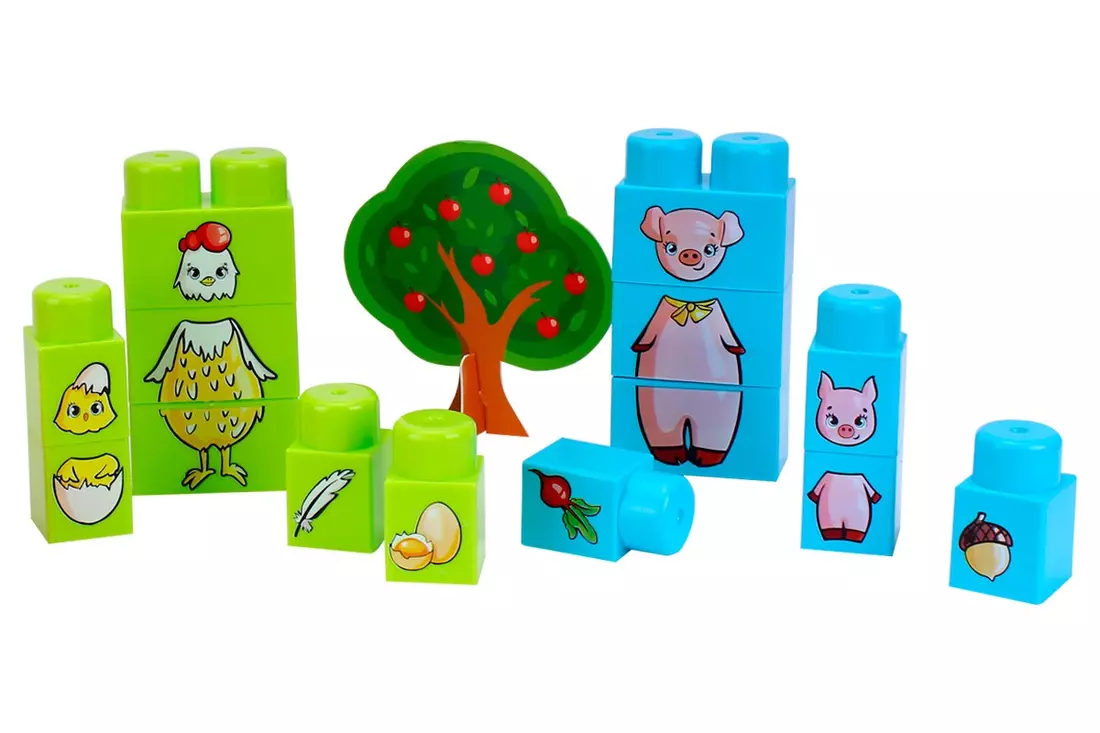 Як зацікавити дитину навчанням? Зробити це у формі гри! Для дітей, ба навіть, дорослих, це є найкращим способом освіти. Під час гри малюкам легше концентруватися на процесі навчання та засвоювати нову інформацію, будувати логічні зв'язки і запам'ятовувати складні поняття. Поштовхом до створення іграшки стала розповідь нашої юної дизайнерки Тані. Одного разу вона розповіла нам про першу в її житті подорож в село. Типове «дитя асфальту», Таня вперше потрапила до своєї бабусі в село в передгір'ї Карпат в 3 роки. І найбільше, що вона запам’ятала з цієї подорожі - це шум гірської річки та милі тваринки господарства бабусі. Вже ввечері вона з захопленням розповідала мамі телефоном, що в бабусі Галі є корівка Муха і телятко Сабріна, корівка пасе травичку та дає молоко та сметану для маленької Тані, курочка несе яєчко, а з вовни овечки роблять м'якенькі светрики. Ми вирішили перетворити дитячі спогади в гру-конструктор, яка допоможе діткам вивчити назви свійських тварини, їх "дітей", улюблені страви та сферу застосування. Всі «герої» нанесені на елементах різного кольору,що значно полегшить пошук відповідних картинок. Діткам потрібно самостійно зібрати основну фігуру з трьох великих цеглин: голова, тулуб і ніжки. А з менших цеглин підібрати їх малюків та смаколики. Додаткового ігрового моменту додає також картонна фігура дерева, яке можна зібрати на ніжку та використовувати під час різноманітних ігор. Крім основної мети – вивчати тварини, іграшка є звичайним конструктором, з якого легко конструювати вежі, будиночки, мости та різні фігури. Всі елементи відвідають по розмірах серії Конструктора ТехноК з великими блоками та можуть поєднуватися з ними. Зображення на цеглини нанесено сучасною технологією – термотрансфер. Такі зображення яскраві, не стираються після багаторазового використання та миття. Всі елементи конструктора виготовленні з високоякісної сировини, без запаху. Головна перевага цієї іграшки— це розвиток важливих навичок для повноцінного розвитку малюків. Конструювання з різних елементів розвиває дрібну моторику та допомагає тренувати координацію рухів. Також, батьки, граючись з дітками, вчать їх новим словам і поняттям: назви кольорів, форм і тварин. Захопливі ігри з конструктором виховують увагу, терпіння та посидючість. Граючись разом, дітки розвивають соціальні та комунікативні навички. Їм доводить співпрацювати, обговорювати подальші кроки та домовлятися для розв'язання поставлених задач. Пробувати, експериментувати, помилятися та переробляти по новому. Ми вчимося через гру, створюючи щось нове, дізнаємося більше про себе та світ! У наборі 35 великих деталей, зручних для діточок вже від 2-х років, картонна фігура дерева. Пакування – яскрава коробка з "віконечком".