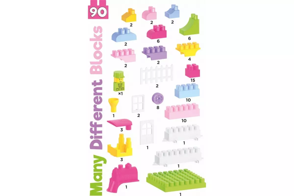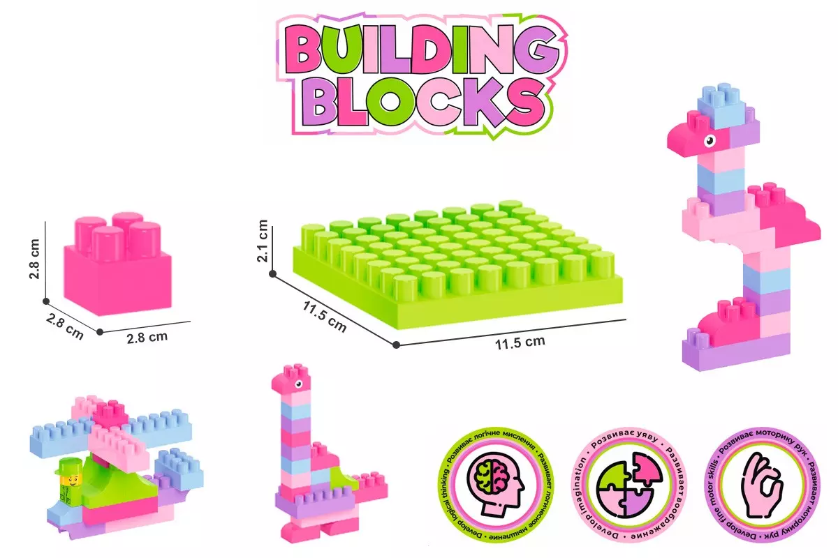 Конструктор – одна з найпопулярніших іграшок серед дітей різного віку. Адже це не тільки захоплива гра, а також корисне розвивальне та навчальне приладдя. Можна сконструювати автомобіль, будиночок, космічний корабель та вивчити додавання і дроби! У наборі 90 цікавих різноманітних деталей вишуканих рожевих кольорів, які так полюбляють юні принцеси. Цеглини зі зрізаними кутами та арками для кораблів чи потішних тваринок, парканчики, віконечка та двері для казкових замків. Нова велика пластина у конструкторах цієї серії — незамінний елемент для будиночків та інших архітектурних форм. Так помешкання для ляльки стає міцнішим, його легко переносити та зручно гратися. Платформи з колесами – взагалі знахідка. Можна збудувати автомобіль, потяг чи літак. А ще платформа стане в пригоді при конструюванні роботів. Фігурка "людини" та додаткові зображення "очей", нанесені методом тамподруку на фігурних елементах – цікава опція, яка додає "життя" конструктору. Зібрані рибки та фламінго відразу "оживають", з ними діткам цікавіше гратися та, особливо, розмовляти. "Конструктор ТехноК" відповідає всім вимогам безпеки, в елементів відсутні гострі краї та сторонній запах. Деталі мають яскравий колір, що не залишається на дитячих пальчиках. Цеглини приємні на дотик, легко складаються, водночас зібрана конструкція міцна та тримає форму. Кольорова покрокова інструкція є необхідністю, особливо коли дитина знайомиться з конструктором. Збираючи моделі згідно з інструкцією, малюки досліджують можливості конструктора та вивчають ази побудови базових фігур. Зручне пакування у валізі з прозорою кришкою неодмінно сподобається малюкам та батькам. Валіза – це також цікава іграшка, у якій можна перевозити конструктор та інші іграшки. Чим все ж таки корисні ігри з конструктором? Головна перевага цієї іграшки — це розвиток важливих навичок для повноцінного розвитку дітей. Конструювання з різних елементів розвиває дрібну моторику та допомагає тренувати координацію рухів. Також, батьки, граючись з дітками, вчать їх новим словам: назви кольорів, форм, тварин, будівель та транспорт. Складаючи цілу конструкцію, у дітей розвивається уява та просторове мислення. Захопливі ігри з конструктором виховують увагу, терпіння та посидючість. Граючись разом, дітки розвивають соціальні та комунікативні навички. Їм доводиться співпрацювати, обговорювати подальші кроки та домовлятися для розв'язання поставлених задач. Пробувати, експериментувати, помилятися та переробляти по новому. Ми вчимося через гру, створюючи щось нове, дізнаємося більше про себе та світ! У наборі 90 цікавих різноманітних деталей у валізі.