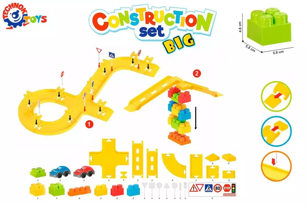 Машинка чи конструктор? Ох, як важко інколи вибрати, адже так хочеться обидві іграшки.А з новинкою "Конструктор ТехноК" Ваш малюк отримає безліч емоцій, адже це цікавий конструктор, швидкісні траси та машинки в наборі. Іграшка "Конструктор ТехноК"– це 44 елементи, серед яких траси з перехрестями та поворотами, спуски, дорожні знаки та 2 машинки. Будівельні цеглини великі та зручні для маленьких діточок. Для швидких автомобілів - цікаві автомагістралі з крутими поворотами та великими перехрестями. При цьому форму дороги дітки обирають самостійно, адже вона складається як конструктор з різних елементів. Для вивчення правил дорожнього руху у наборі 7 дорожніх знаків. Міні машинки із зображеннями "очей", нанесених методом тамподруку – цікава опція, яка додає "життя" конструктору. На допомогу юним будівельникам – детальна покрокова інструкція з різними . Конструктор – одна з найпопулярніших іграшок серед дітей різного віку. Адже це не тільки захоплива гра, а також корисне розвивальне та навчальне приладдя. Можна сконструювати автомобіль, будиночок, космічний корабель та вивчити додавання і дроби! "Конструктор ТехноК" відповідає всім вимогам безпеки, без гострих країв та стороннього запаху. Деталі мають яскравий колір, що не залишається на дитячих пальчиках. Елементи приємні на дотик, легко складаються, водночас зібрана конструкція міцна та тримає форму. Кольорова покрокова інструкція є необхідністю, особливо коли дитина знайомиться з конструктором. Збираючи моделі згідно з інструкцією, малюки досліджують можливості конструктора та вивчають ази побудови базових фігур. Пробувати, експериментувати, помилятися та переробляти по новому. Ми вчимося через гру, створюючи щось нове, дізнаємося більше про себе та світ! Пакування – пакет У наборі 44 елементи: дороги, конструктор машинки і дорожні знаки. Для дітей від 3-х років.