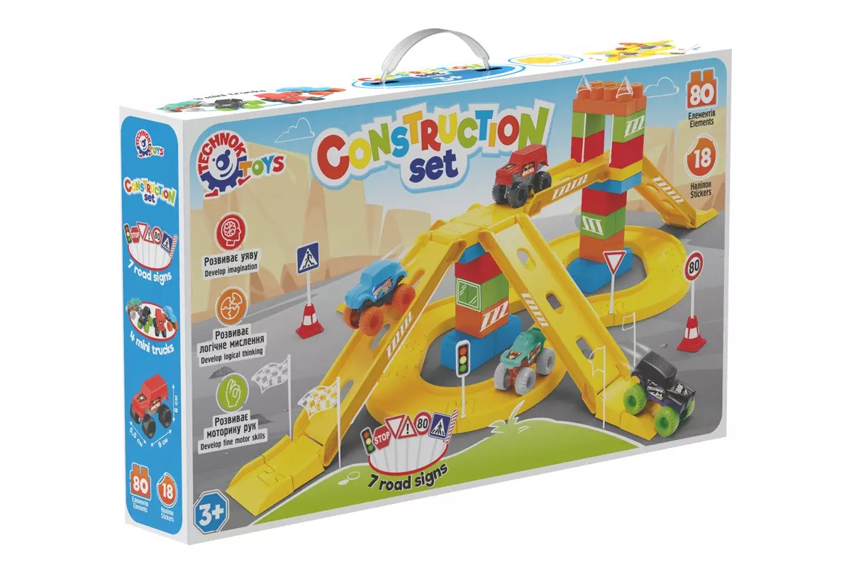 "Конструктор ТехноК 8461" – іграшка, яка подарує малюку безліч щасливих і приємних моментів. Це цікавий конструктор зі швидкісною трасою,з якого дитина може побудувати дороги з крутими поворотами та мостами, а потім провести гонки на чотирьох мінітраках, які також є в наборі. Іграшка складається з 80 різноманітних елементів, серед яких: елементи траси з перехрестями та поворотами, спуски, дорожні знаки та машинки. Будівельні блоки зручні та легко з’єднуються. Форму дороги дітки обирають самостійно, адже вона складається, як конструктор, з різних елементів. У наборі також 7 дорожніх знаків, які допоможуть розвивати пам'ять, увагу та спостережливість юних автомобілістів. "Конструктор ТехноК" відповідає всім вимогам безпеки, у елементів відсутні гострі краї та сторонній запах. Деталі мають яскравий колір, приємні на дотик і водночас зібрана конструкція міцна та тримає форму. Чудовий подарунок для дівчаток та хлопчиків віком від 3 років. Головні переваги конструктора - це розвиток важливих навичок дітей: дрібної моторики, координації рухів, уяви та просторового мислення. Граючись з друзями дітки розвивають соціальні та комунікативні навички. У наборі є детальна кольорова покрокова інструкція, яка допоможе краще ознайомитись з усіма можливостями конструктора. Щоб збільшити та розширити конструктор і побудувати іграшковий мегаполіс