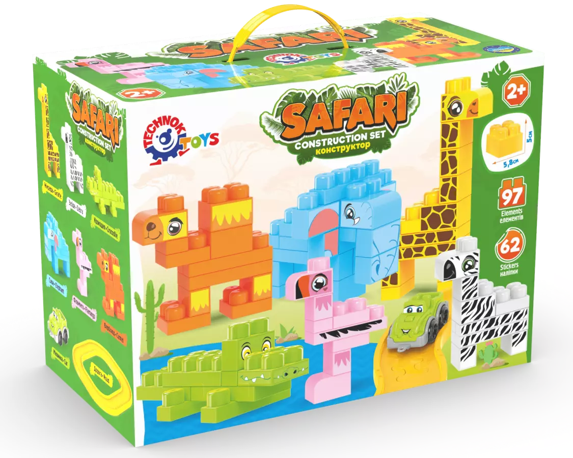 "Конструктор Сафарі" - це захопливий набір, який дає можливість дитині побудувати свій власний живий світ Африканського сафарі. Набір складається з 97 елементів та 62 наліпок, що дозволяє дитині збудувати чудовий світ сафарі з незабутніми тваринами та цікавими пригодами. З допомогою конструктора, маленькі майстри можуть створити свій власний зоопарк екзотичних тварин. Жираф, фламінго, крокодил, слон, верблюд та зебра - кожна з цих чудових тварин може оживати в руках вашої дитини. Чудова можливість розкрити свою творчість та фантазію в процесі складання. Додатково до конструктора надаються 62 наліпки, які допомагають надати тваринкам виразності та реалізму. Це відмінна можливість навчитися деталізації та навіть обрати свою найулюбленішу тваринку. Але гра з конструктором не закінчується лише складанням тваринок. В наборі також міститься дорога і позашляховик, що дає змогу створити різноманітні сценарії гри. Маленькі дослідники можуть вирушити в екзотичну подорож по африканському континенту і познайомитись зі світом тварин. "Конструктор Сафарі" не лише сприяє розвитку творчості та уяви, але й допомагає розвивати дрібну моторику, креативне мислення та просторову уяву. Запрошуємо вашу дитину у світ великих пригод і незабутніх ігор.