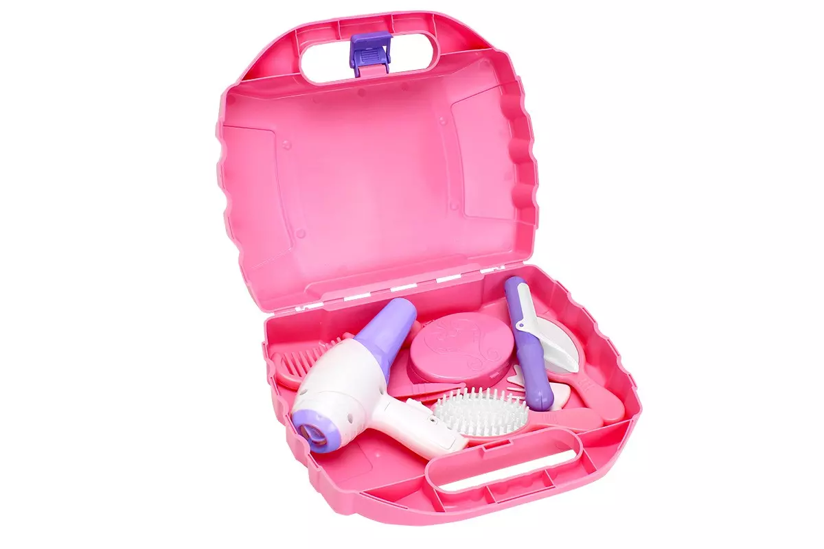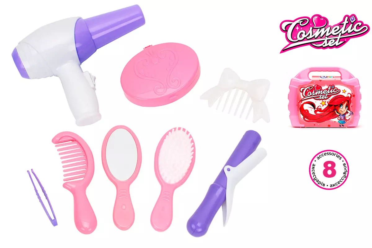 Косметичний набір - мрія кожної дівчинки. Відкрити для подружок, накрутити лялькам волосся, зробити укладку матусі та, просто, припудрити носик, все це можна зробити з косметичним набором від ТехноК! У комплекті є все необхідне для щоденно догляду: гребінець, щітка та шпилька у формі бантика для модної зачіски. Якщо ж хочеться кучерявих локонів-у пригоді стане плойка. Дзеркальце з ручкою, пінцет та пудрениця будуть завжди під рукою для ідеального макіяжу. А щоб гарно просушити волосся та зробити легку укладку варто використати фен. Тепер у маленької модниці все буде все як у мами. Розміри іграшкового приладдя оптимально розраховані для дівчаток. Також їх можна взяти з собою у сумочку на прогулянку чи у дитячий садок. Після гри всі іграшки зручно зберігати та переносити у рожевому саквояжі. З косметичним набором від ТехноК кожна дівчинка відчує себе справжньою принцесою! Іграшка виготовлена з міцного якісного пластику, без запаху. Комплектація: фен, плойка, гребінець, щітка, дзеркальце, заколка гребінець, пудрениця, пінцет. Для дітей від 3-х років. Пакування– саквояж з кольоровим картонним поясом.