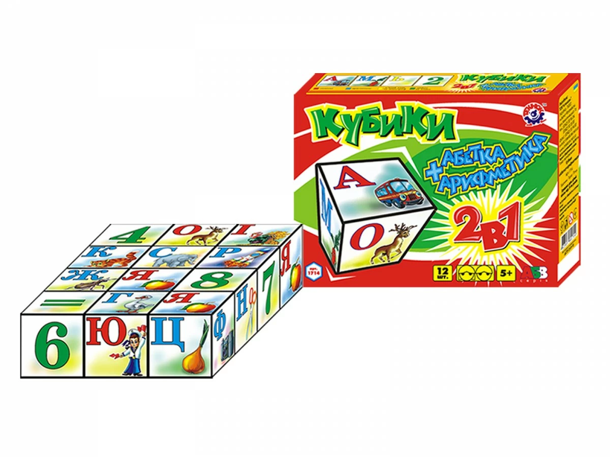 Набір складається з 12 кубиків з цифрами, буквами українського алфавіту і малюнками. На кожній грані кубика - буква і зображення предмета, назва якого починається на цю букву, або цифра і відповідний цифрі малюнок. Упаковано в картонну коробку. Габаритні розміри 6,5 х 12,5 х 4 см Вага 167 г Розміри упаковки 39 х 39 х 29 см